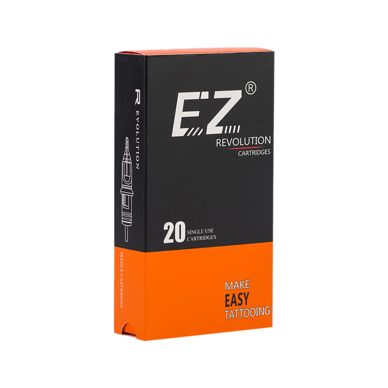 Cartucce EZ Revolution Round Shader Long Taper con membrana anti-reflusso e acciaio medicale 304. Sterilizzate EO Gas, precisione e sicurezza per tatuatori professionisti.