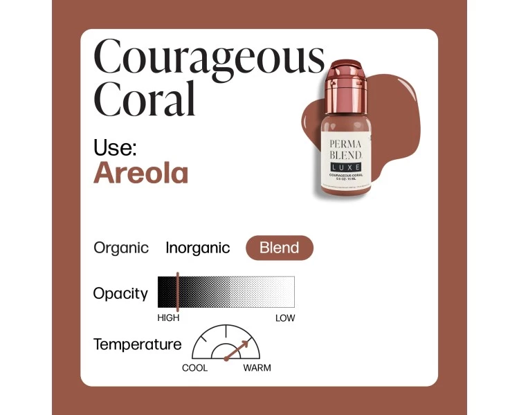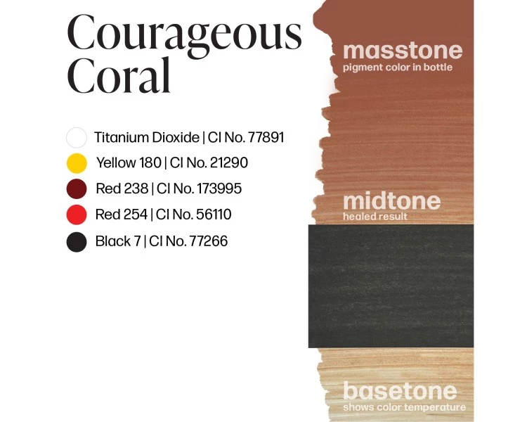 Courageous Coral è un pigmento carne-corallo, che spazia da un rosa opaco a un nude scuro, progettato per offrire alta coprenza e massimo controllo cromatico nei trattamenti paramedicali.