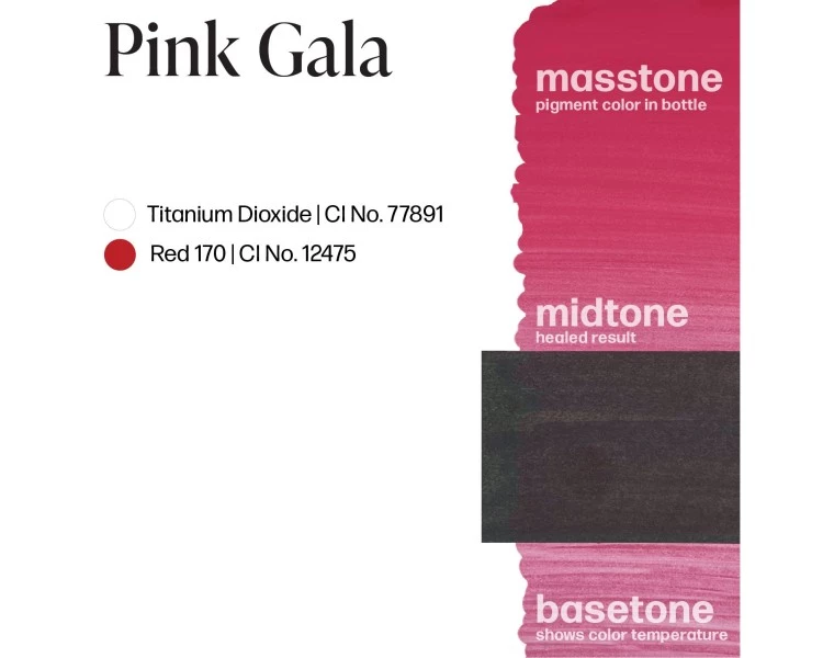 ink Gala – un colore delle labbra rosa medio intenso con opacità media e sottotono più neutro. Biologico.