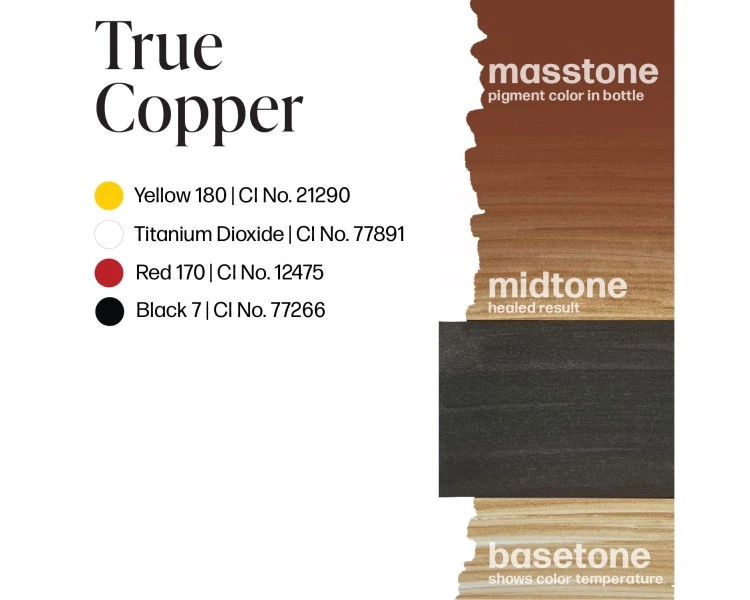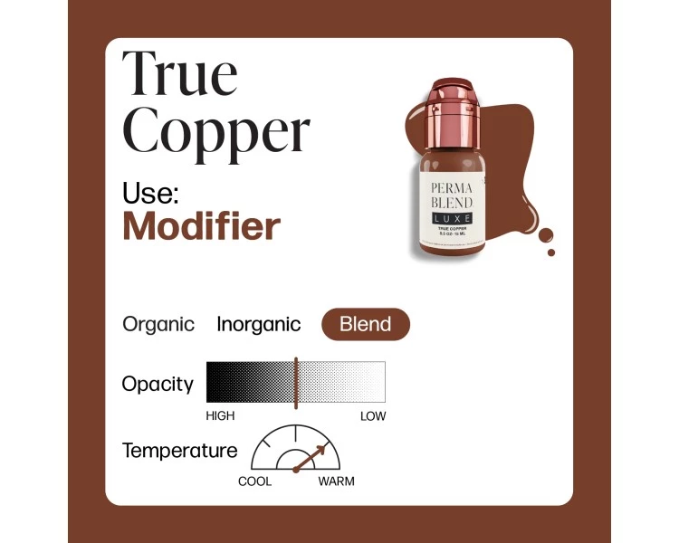 True Copper è un modificatore medio a opacità media della linea Perma Blend Luxe, formulato con una miscela ibrida organica + inorganica per garantire stabilità, lunga durata e ottima ritenzione intradermica.