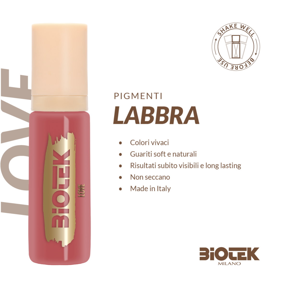 Love è un pigmento labbra rosa medio, perfettamente bilanciato tra rosa e rosso mattone. Dona un colore elegante e versatile, ideale per valorizzare le labbra con un effetto naturale ma visibile.