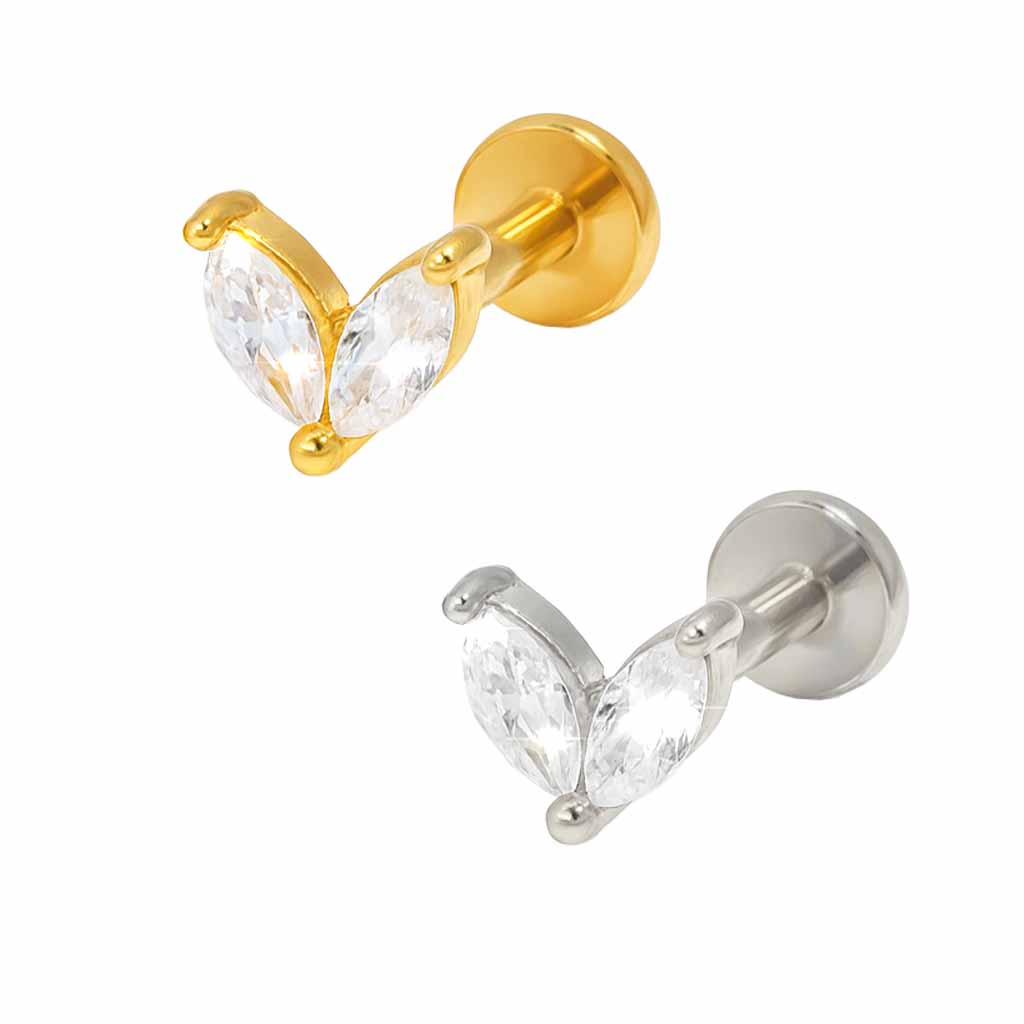 Le due pietre taglio marquise, disposte in diagonale, creano un effetto armonioso e luminoso, perfetto per chi cerca un piercing discreto ma dal carattere deciso.