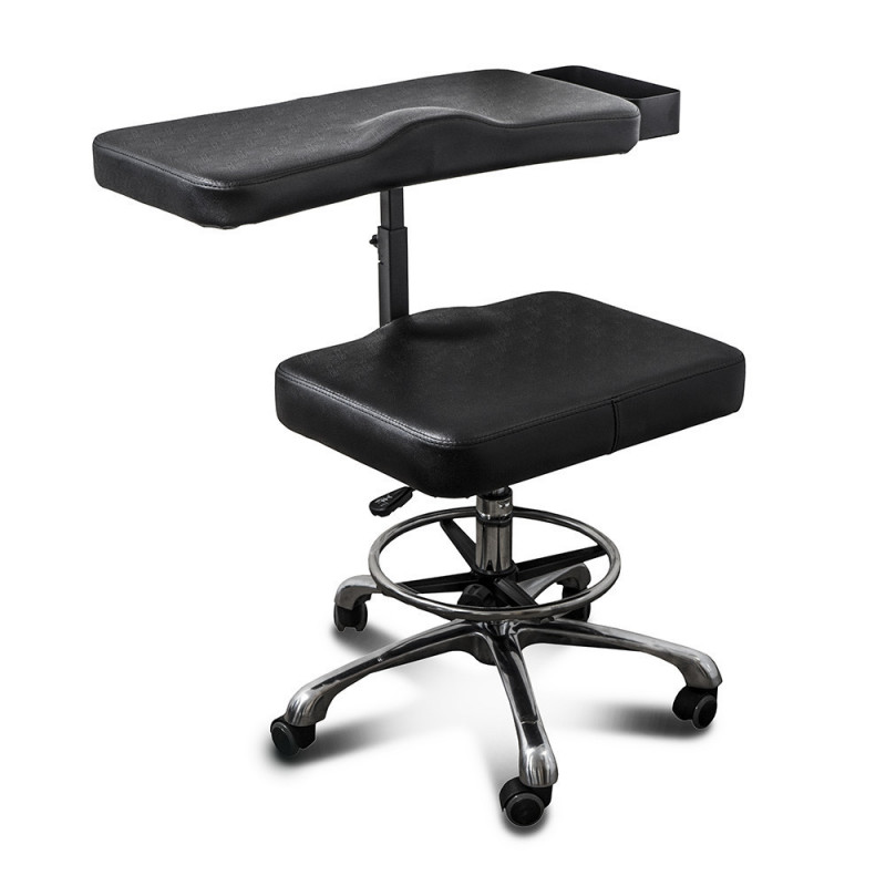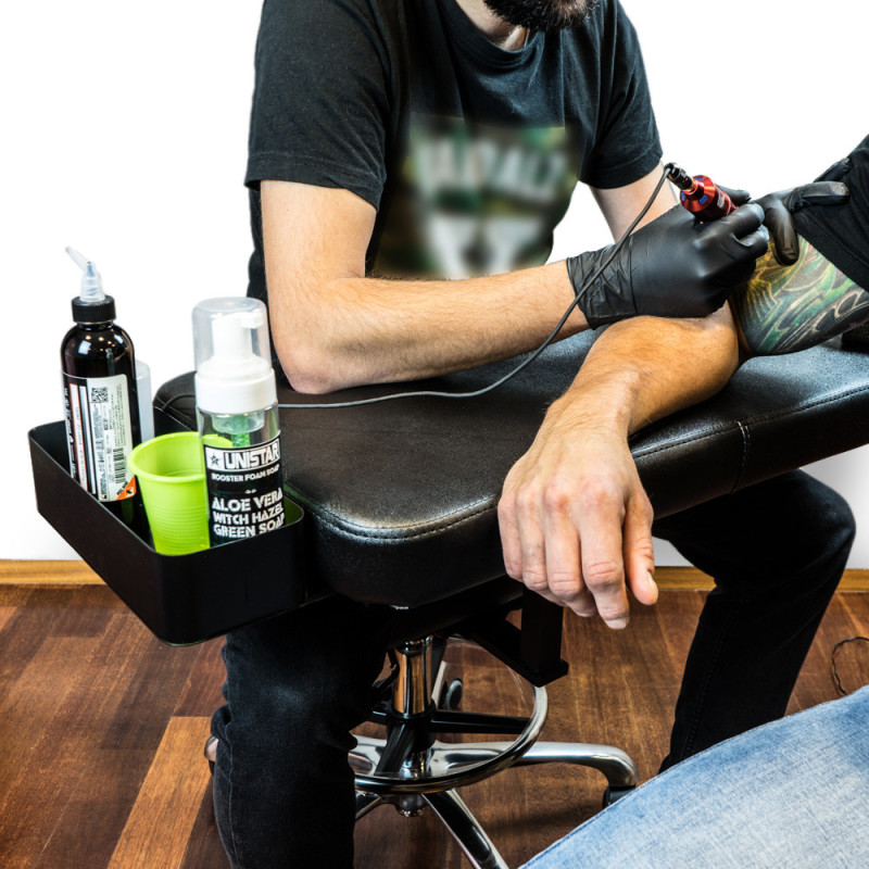 L’ampio bracciolo è stato installato centralmente davanti alla seduta, creando un comodo piano di lavoro sul quale cliente e tatuatore possono appoggiare liberamente le mani durante il lavoro. Il bracciolo ha un ripiano profondo per tutti gli accessori necessari per il tatuaggio, così sono sempre a portata di mano.